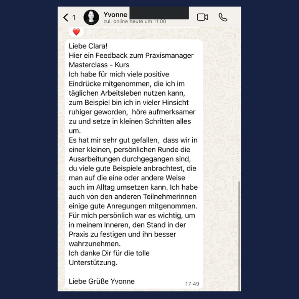 Super, dass du dich für meine PRAXISMANAGER MASTERCLASS entschieden hast! Ich freue mich nicht nur auf dich, sondern vor allem für dich – denn damit legst du den Grundstein für deine nächste Stufe als Praxismanager.
